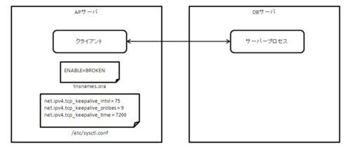 想像で書いてますw 前提 OS が Linux の場合の説明です。 tnsnames.ora に ENABLE=BROKEN を記述する。 クライアント側で以下の通りカーネル・パラメータが設定されているとする。 % sysctl -a|grep keepalive net.ipv4.tcp_keepalive_intvl = 75 net.ipv4.t…