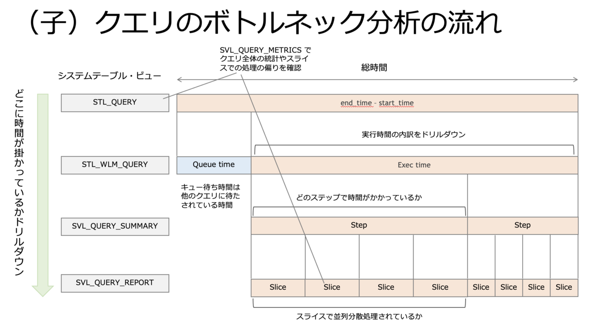 Redshift でクエリを実行すると1つのクエリが複数の子クエリに分割されて実行される場合がある。その場合はどの子クエリに時間を要しているかを確認し、遅い子クエリを深掘りしてボトルネックを特定していく。